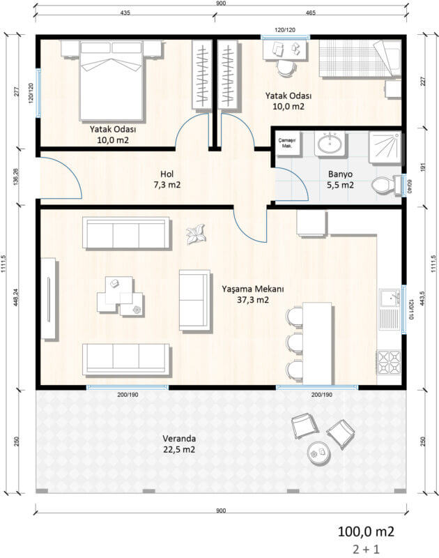 Standing out with its modern design, durable structure and aesthetic details, SS-1100 Steel House offers both a safe and comfortable living space. The 100 m² interior space creates a spacious atmosphere with its functional usage areas, while the 22.5 m² veranda is designed for you to have pleasant moments in touch with nature.