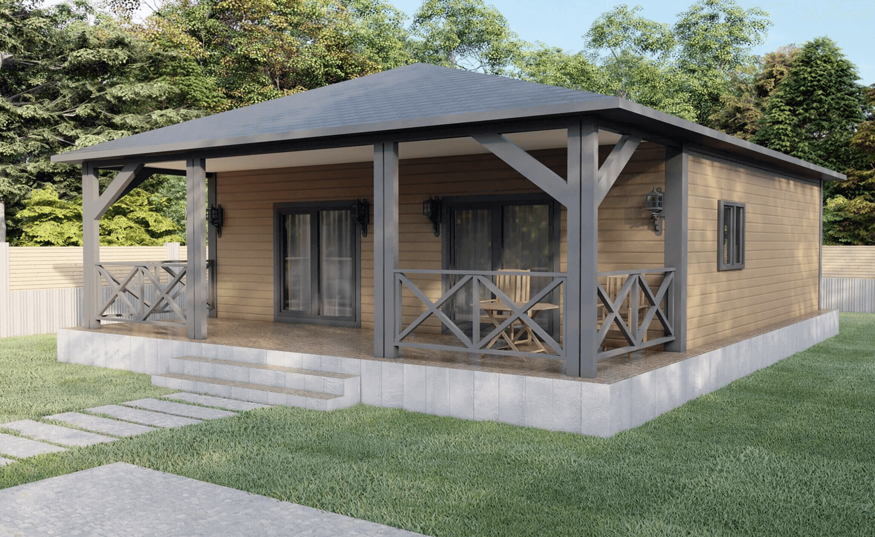 The wooden exterior combined with the steel frame system provides a natural and robust structure. Decorative plaster, Betopan and Yalıpan cladding ensure the longevity of the house against external factors, while the hipped roof system and glass wool insulation offer superior thermal insulation and guarantee four-season comfort.